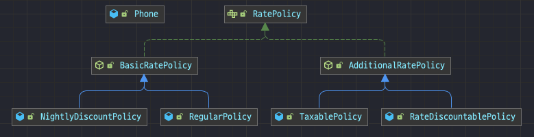 자! 이제 합성 관계로 변경에 유연한 설계로 바꿔보자. 우선 정책을 별도의 클래스로 구현하자. 여러 정책들을 연결할 수 있도록 하자. 기본 정책과 부가 정책을 포괄하는 RatePolicy 인터페이스를 추가한다.
