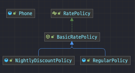 추상 메서드 claculateCallFee를 오버라이딩해서 각자 방식에 따라 요금을 계산하는 메서드를 만들면 된다. 일반 요금제인 RegularPolicy와 심야 할인 요금제 NightlyDiscountPolicy를 구현해 보자.
