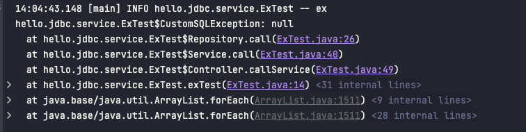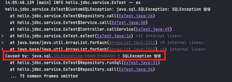 위의 방법으로 리포지터리에서 체크 예외를 언체크 예외로 전환해 던져주면 된다. 하지만 여기서 중요한 게 있다. 기존 예외를 꼭 포함시켜야 한다. RuntimeException을 상속받아 구현을 해야 할 때 Throable cause를 매개변수로 받는 생성자에 꼭 넣어줘야한다. 위의 경우 예외를 던질때 throw new CustomSQLException(); 기존 예외를 포함시켜 주지 않았기 때문에 로그를 확인해보면 기존 예외가 확인이 되지 않는다.